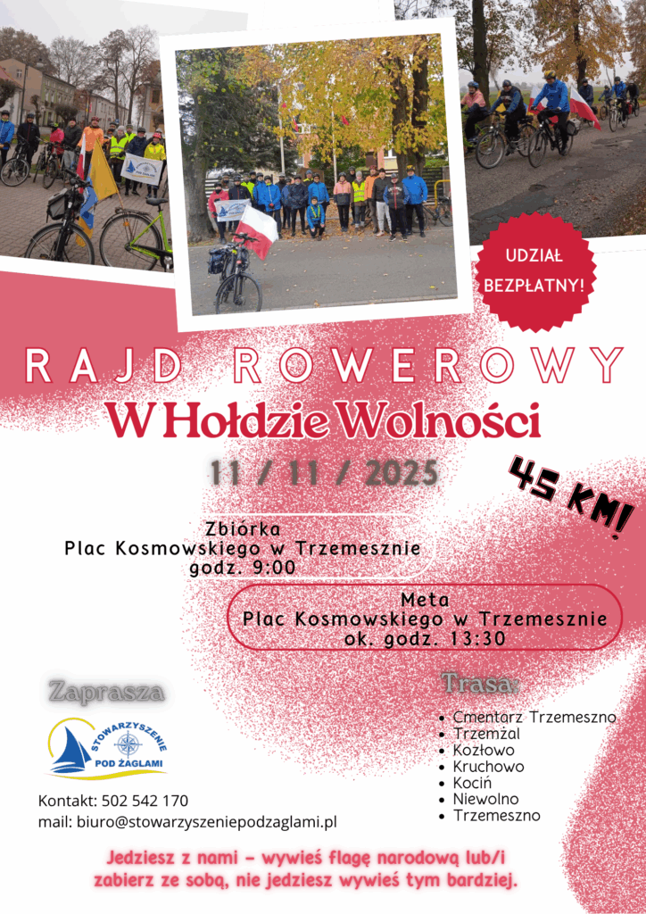 Stowarzyszenie pod Żaglami – sekcja rowerowa, w dniu 11.11.2025r. zaprasza miłośników turystyki rowerowej na rajd z okazji Święta Niepodległości.